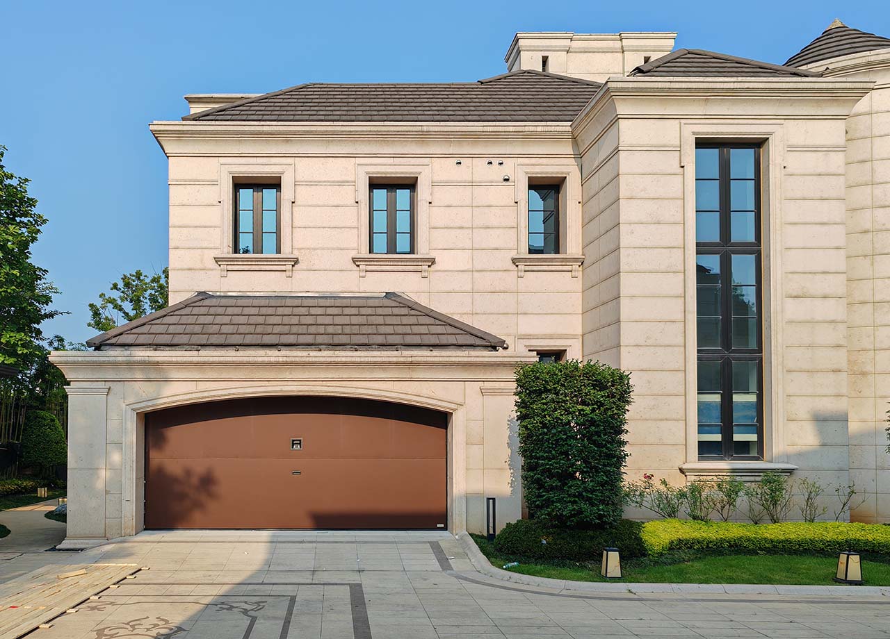 深色的车库门与浅色的建筑相得益彰